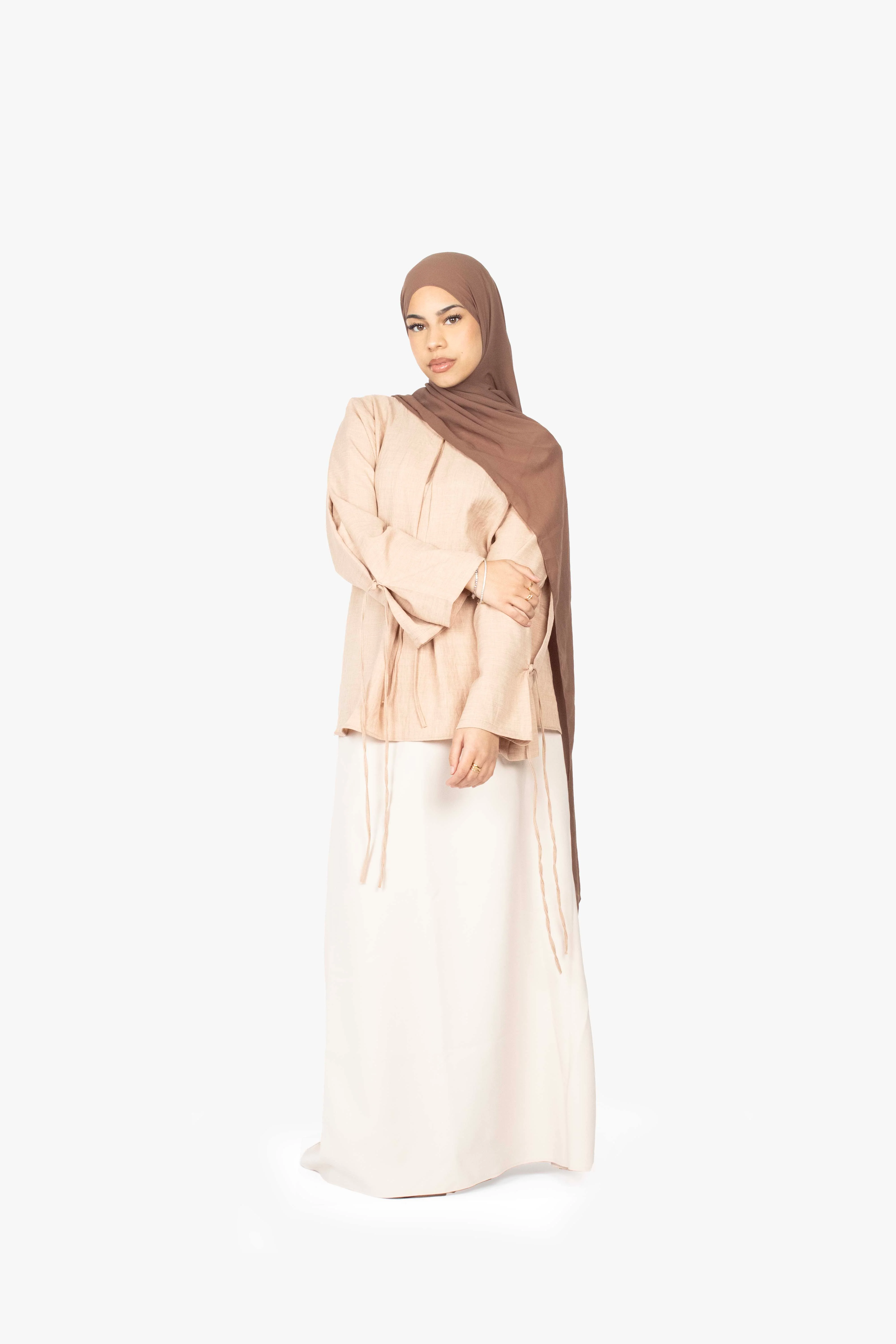 A Spring/Summer staple, our Ribbon Kimono Top in Beige Mélange features a subtle front slit and a ribbon-tied centre.
