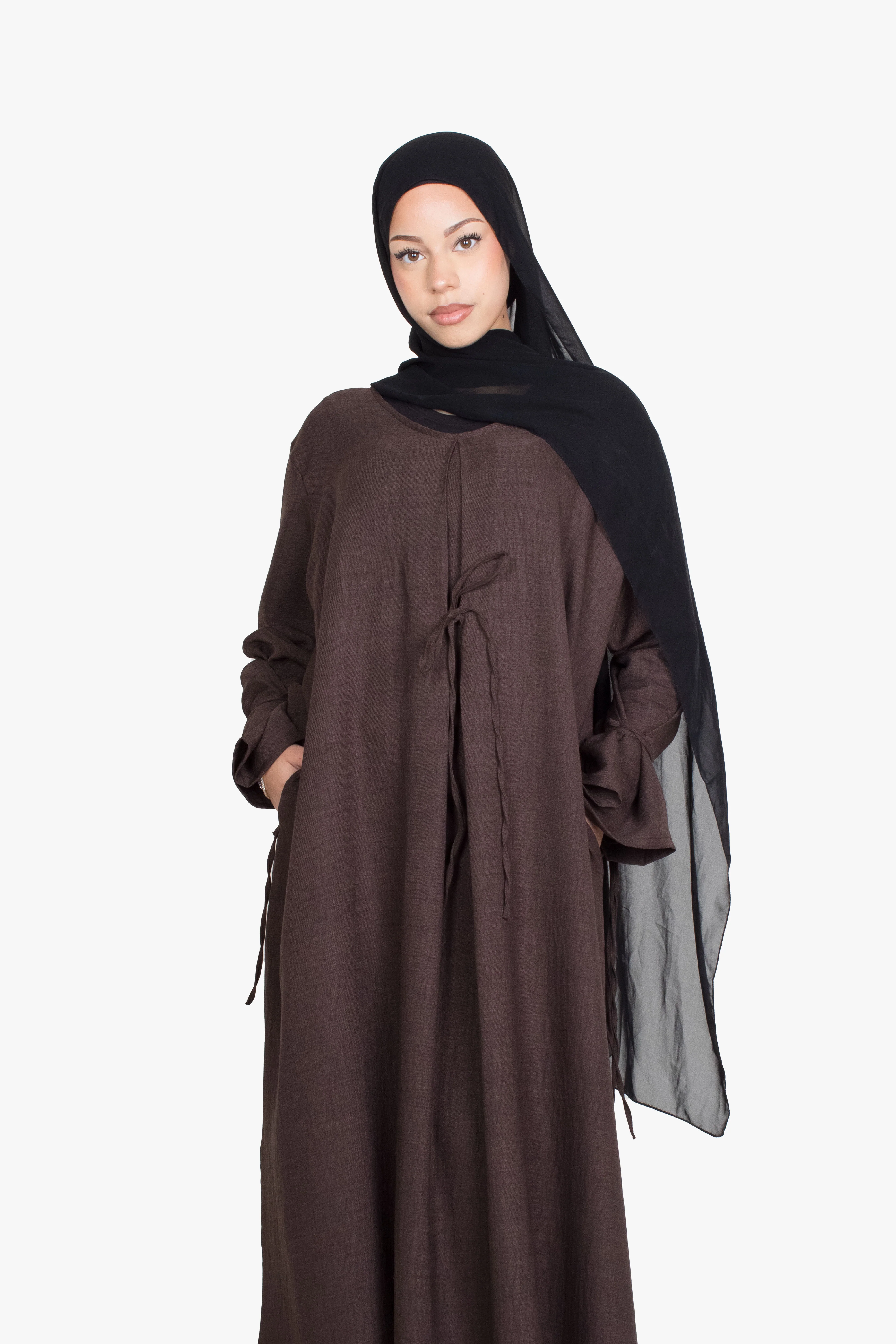 A classic piece with a touch of charm, our Ribbon Kimono Abaya in Coffee Mélange features a subtle front slit and a ribbon-tied centre, and kimono-style sleeves that can be tied into a bow or left open for a relaxed look.