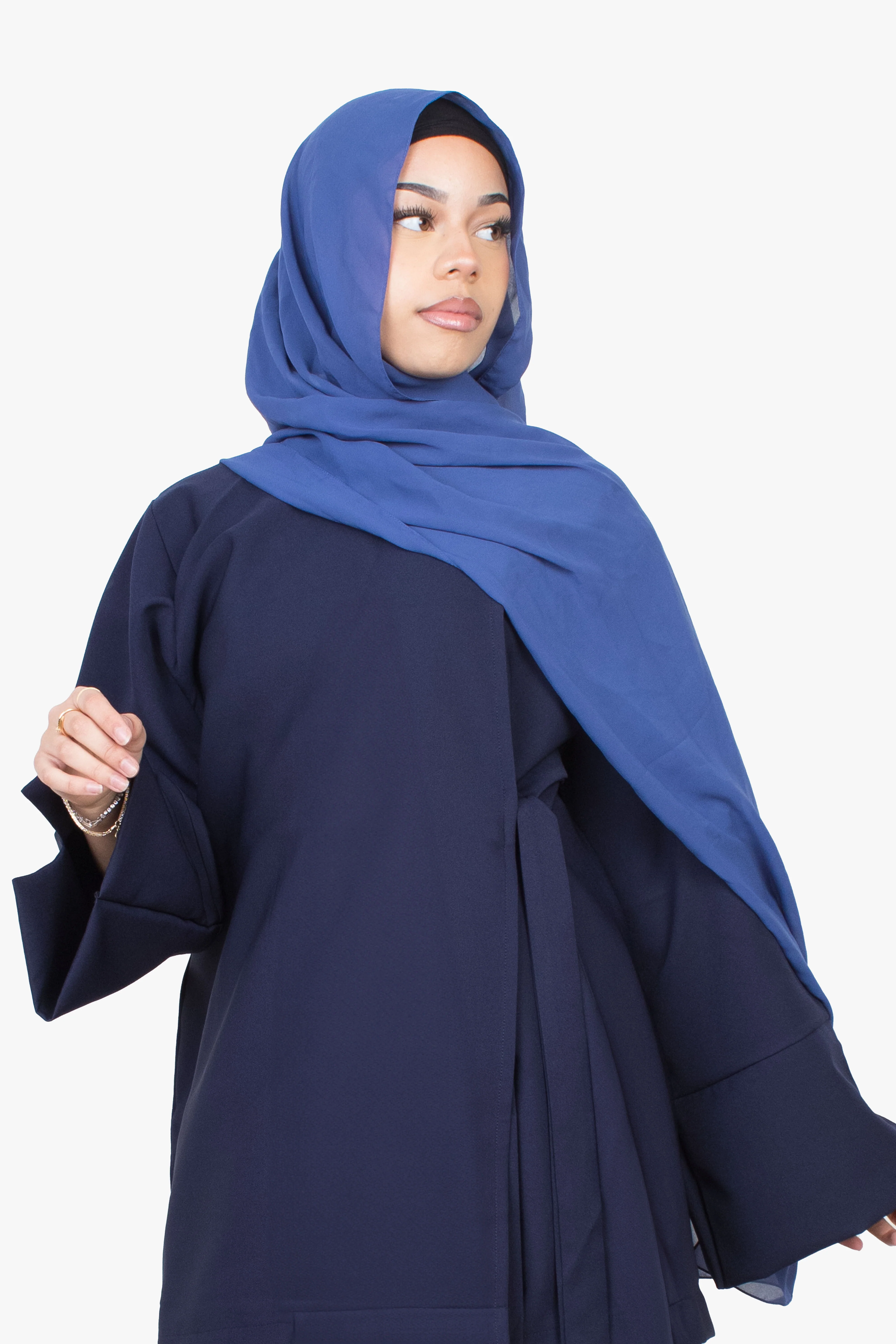 Inspired by two of our most popular designs, our Navy Side Wrap Two-Piece Abaya features rounded sleeves with stylish slits and an attached wrap belt that ties modestly to the side for a graceful look.